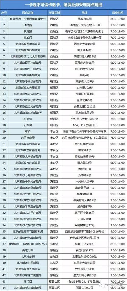 如果你手里的卡片不可读了,就要到指定的44个网点办理退卡业务。也就是下面这些(点开可看大图)——